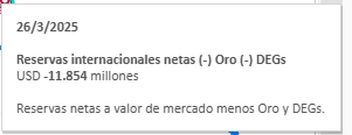 Tal como destaca la consultora 1816, se observa en los datos más recientes, esta dinámica explica la abrupta caída de las reservas netas, que perforaron los US$ -8.500 millones, según cálculos que descuentan pagos de Bopreal a 12 meses pero no los depósitos del Tesoro en dólares.