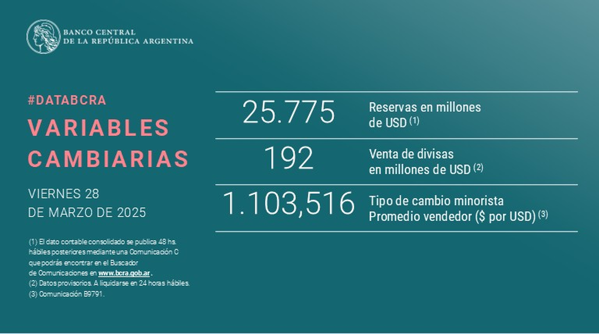 Por otro lado, el stock de reservas brutas cayó US$447 millones respecto del día anterior, ubicándose en US$25.775 millones, el nivel más bajo en 14 meses, desde el 30 de enero de 2024. En el acumulado semanal, la pérdida de reservas alcanzó los US$853 millones.