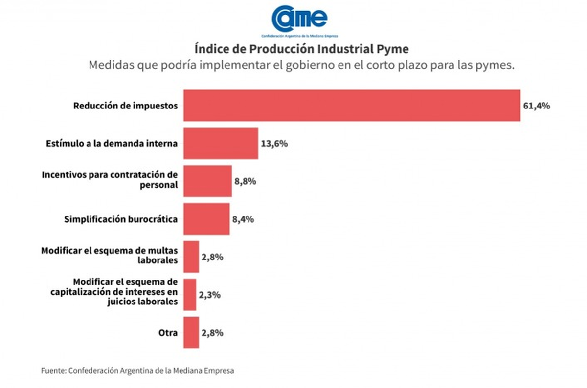 Los resultados mencionados surgieron del Índice de Producción Industrial Pyme que elabora la Confederación Argentina de la Mediana Empresa, CAME, gracias a una muestra que alcanzó a 420 industrias pyme a nivel nacional.