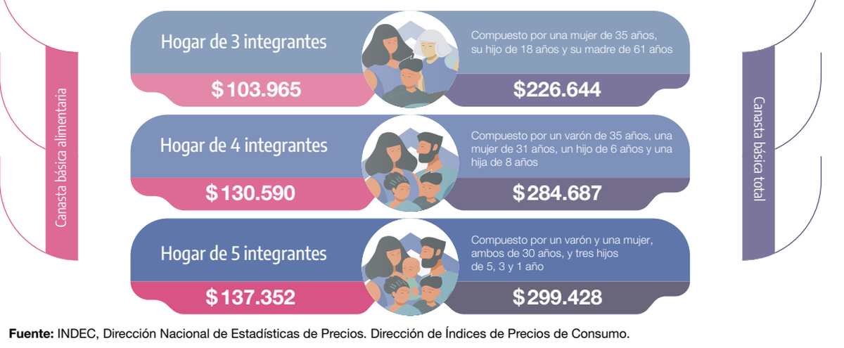 En el mes de agosto, según los datos proporcionados por el INDEC, una familia tipo compuesta por dos adultos y dos menores necesitó contar con un ingreso mínimo de $130.590 para evitar caer en la indigencia. Para superar el umbral de la pobreza, este mismo grupo familiar debió disponer de al menos $284.687.