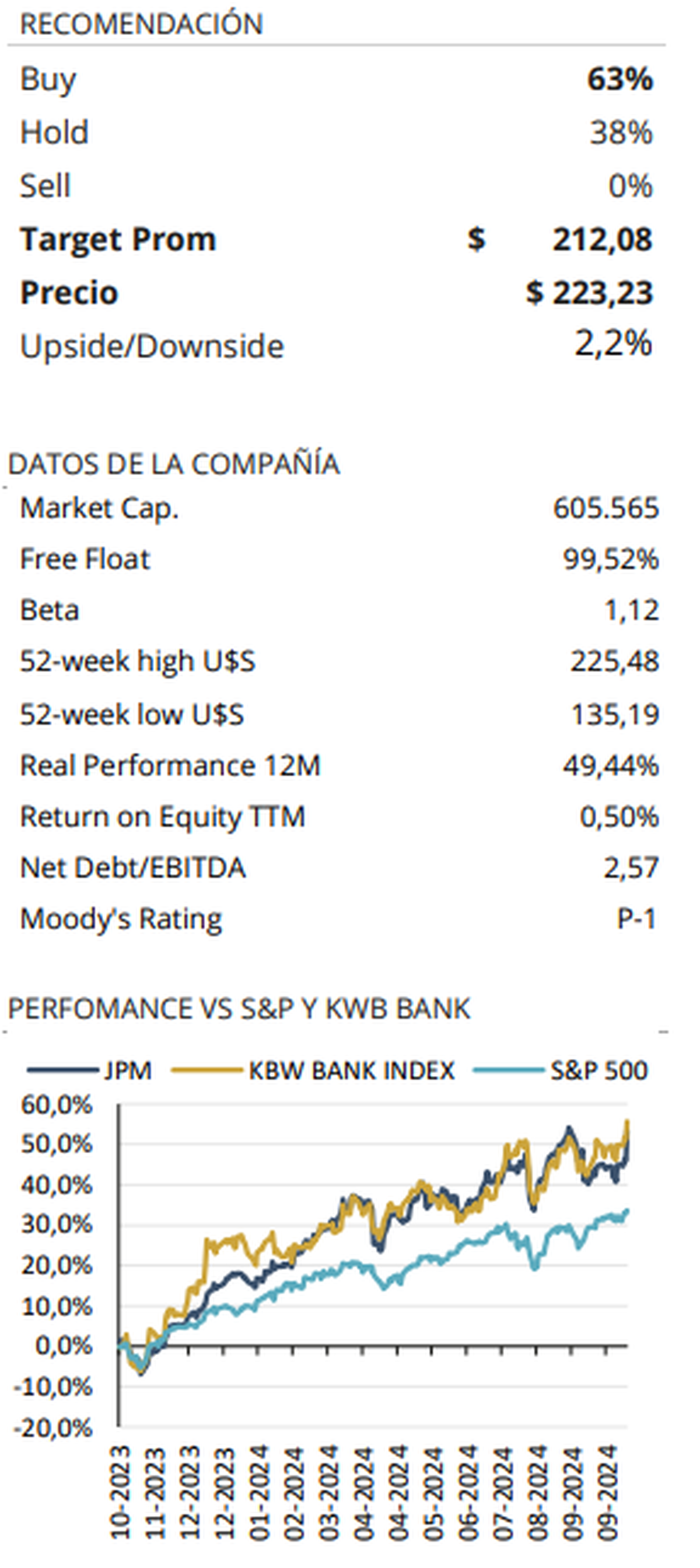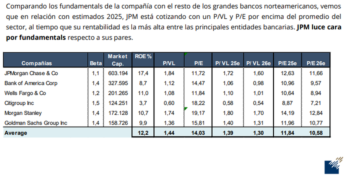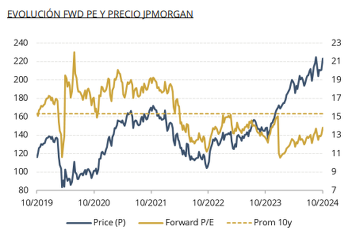 En términos de valoración, las acciones de JPMorgan cotizan actualmente con un ratio P/E (precio sobre ganancias) de 13,8 veces para 2024, por debajo de su promedio histórico de 15,3x y del sector financiero, que opera en 15,36x. Esto indica que, a pesar de su rendimiento superior, la acción aún presenta una oportunidad atractiva para los inversores.