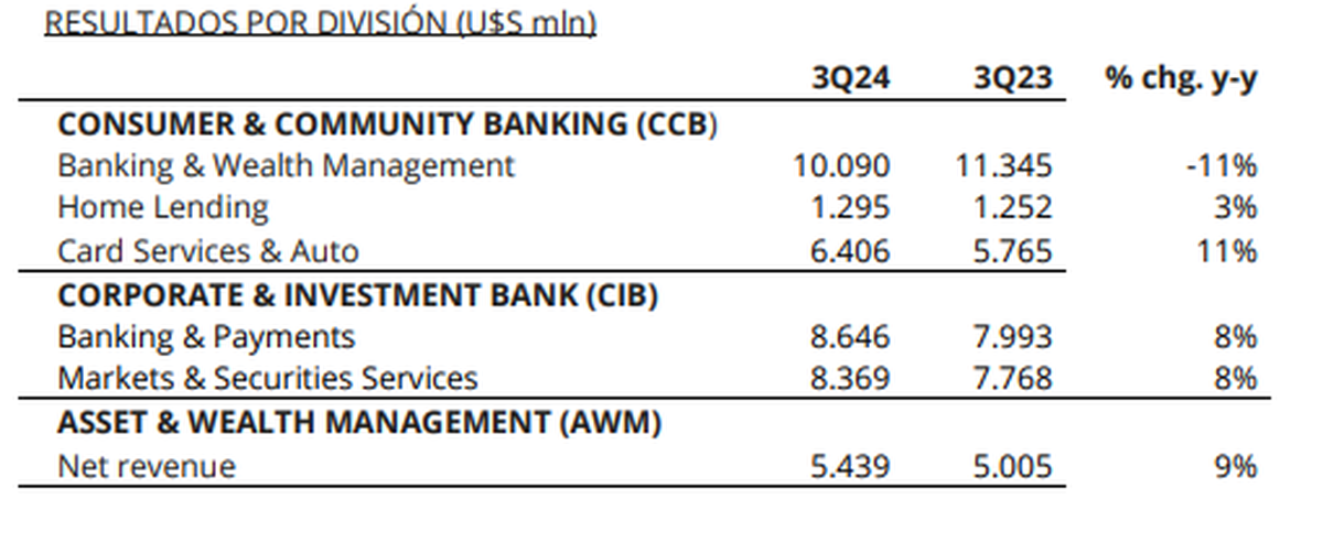 Por otro lado, la división de Consumer & Community Banking (CCB) mostró una caída del 3% en sus ingresos, aunque se destacó el crecimiento en servicios de tarjetas y autos, que aumentaron un 11% interanual.