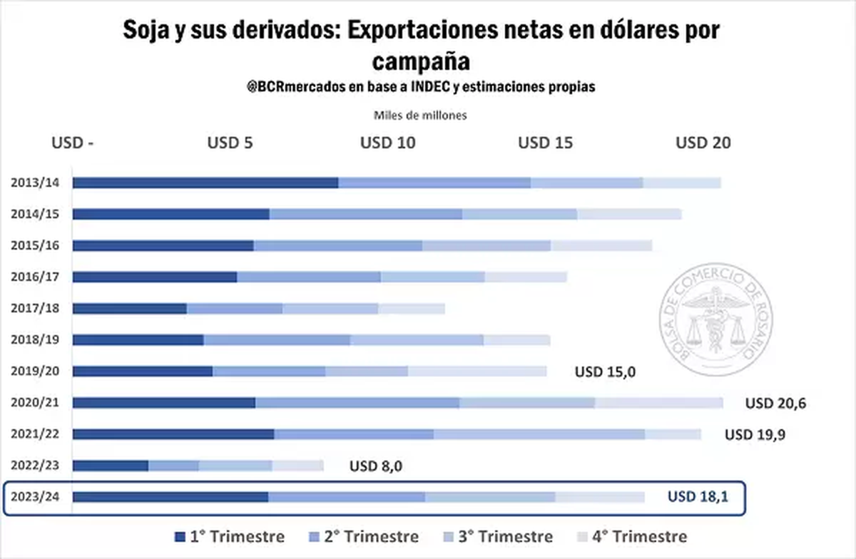 Para la presente campaña, se estima que las exportaciones netas del complejo soja alcancen apenas los US$ 8.000 millones, el valor más bajo en casi dos décadas, desde la campaña 2003/04. Mientras tanto, para la próxima campaña 2023/24 y gracias a la recomposición productiva, se proyecta un ingreso de dólares por exportaciones netas de poroto de soja y productos derivados por US$ 18.000 millones. Esto implica un aumento de US$ 10.000 millones en comparación con la campaña pasada y supera el promedio de los últimos 5 años, aunque aún se ubica por debajo de las cifras registradas en 2020/21 y 2021/22.