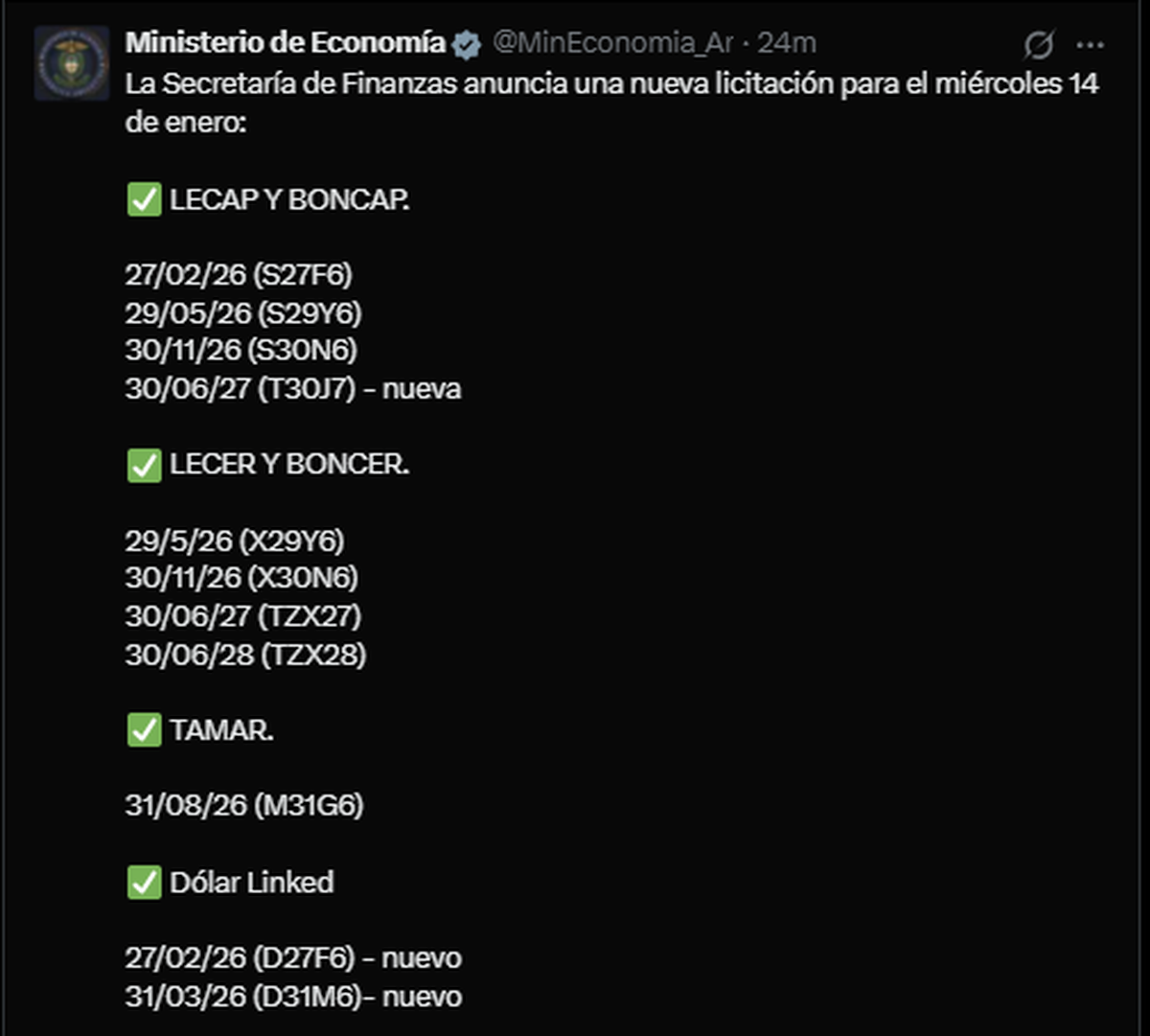 La licitación se realizará el miércoles 14 de enero, con liquidación el viernes 16, y vuelve a mostrar una estrategia clara de diversificar vencimientos, estirar duration y sostener la demanda en pesos, aun a costa de convalidar rendimientos exigentes.