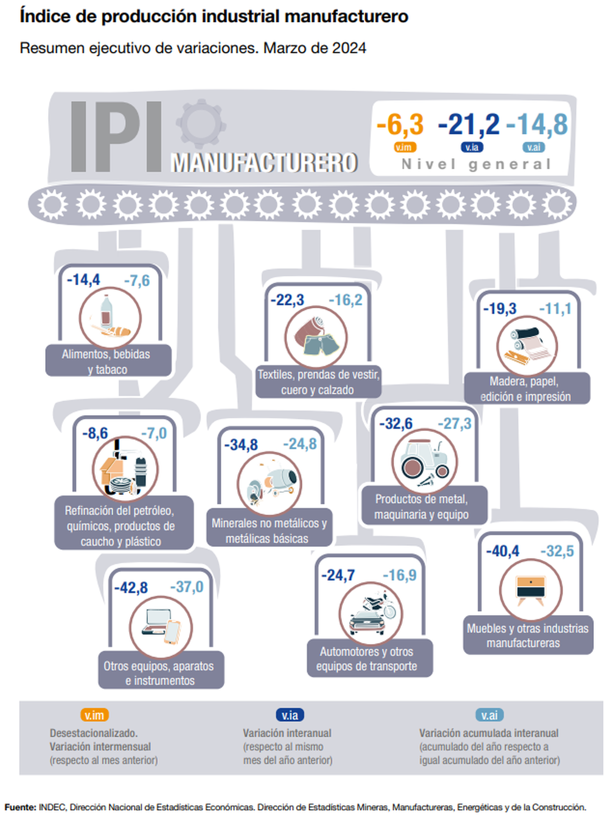 Según el INDEC, el rubro de alimentos y bebidas registró una disminución interanual del 14,2% en marzo y acumuló una baja del 7,8% en el primer trimestre de 2024 respecto al mismo período del año anterior, siendo uno de los sectores más afectados.