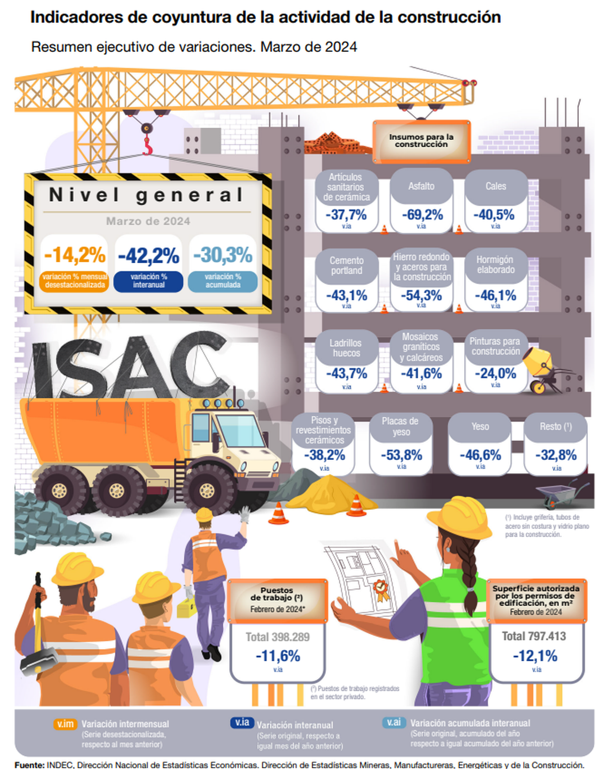 En el caso de la construcción, en marzo de 2024, el Indicador Sintético de la Actividad de la Construcción (ISAC) mostró una baja del 42,2% respecto al mismo mes de 2023. En el acumulado del primer trimestre de 2024, el índice original presentó una disminución del 30,3% respecto al mismo período de 2023.