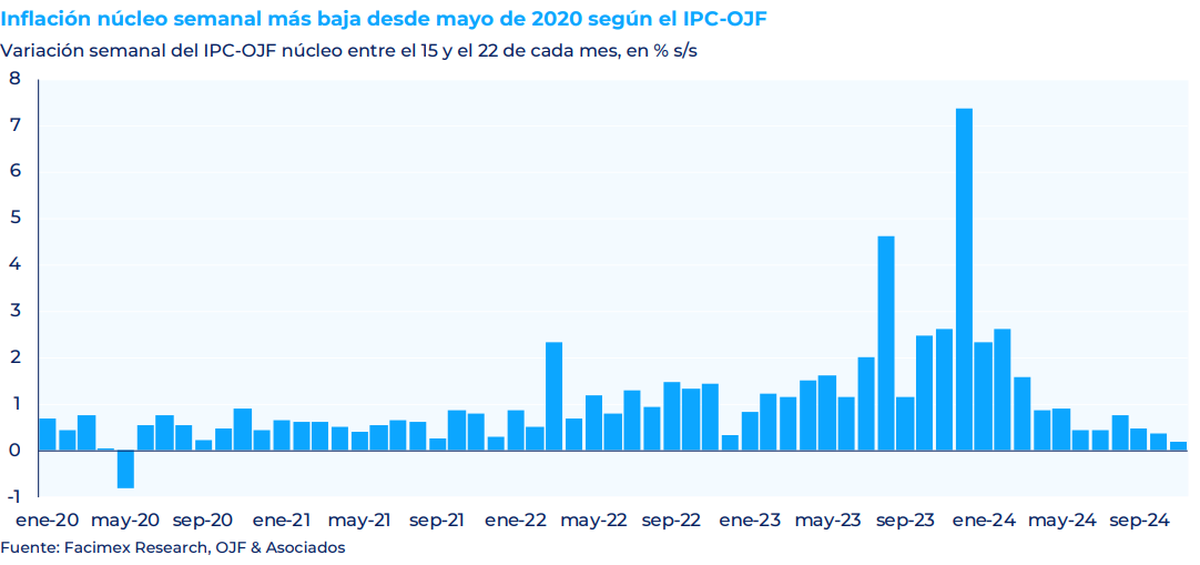 - De acuerdo con Facimex, el IPC-OJF de Ferreres, con datos al 22 de noviembre, midió un aumento semanal del 0,2% para la inflación general y núcleo, marcando el registro más bajo desde mayo de 2020 en este último rubro. Comparado con las variaciones semanales entre julio y octubre, que oscilaban entre el 0,3% y el 0,6%, la cifra representa una significativa mejora.