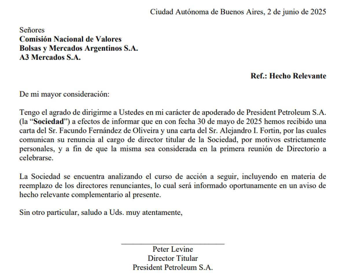 El hecho fue oficializado a través de una carta firmada por Peter Levine, director titular de la firma, remitida a la CNV, a Bolsas y Mercados Argentinos S.A. y a A3 Mercados S.A., bajo la figura de "Hecho Relevante".