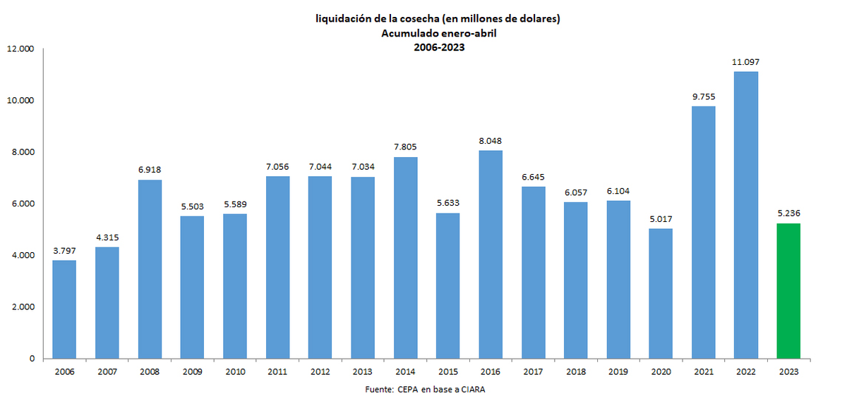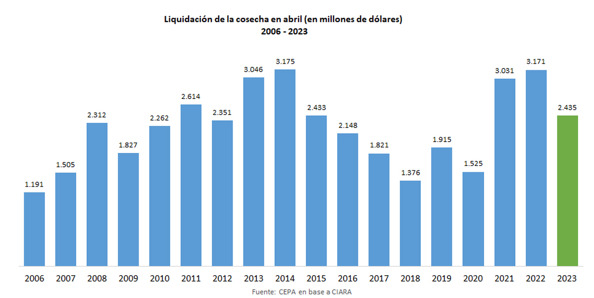 ¿A dónde fue a parar esa plata? Sobre esto, el Centro de Economía Política Argentina (CEPA) remarca que: "En abril, la liquidación de cosecha fue de US$ 2.435 millones: -23% vs. abril 2022 (de liquidación récord). A pesar de la fuerte sequía que redujo la producción con destino a exportación, el nivel de liquidación es similar a 2015 y es el tercero más alto de los últimos 9 años."