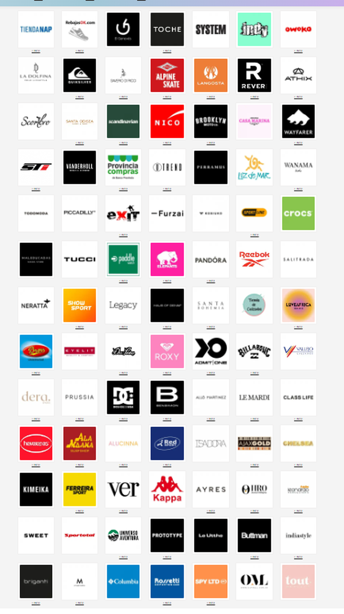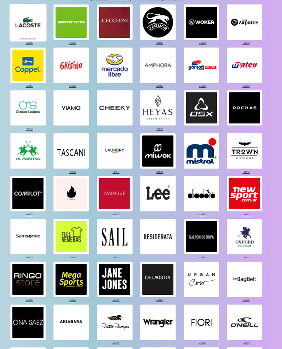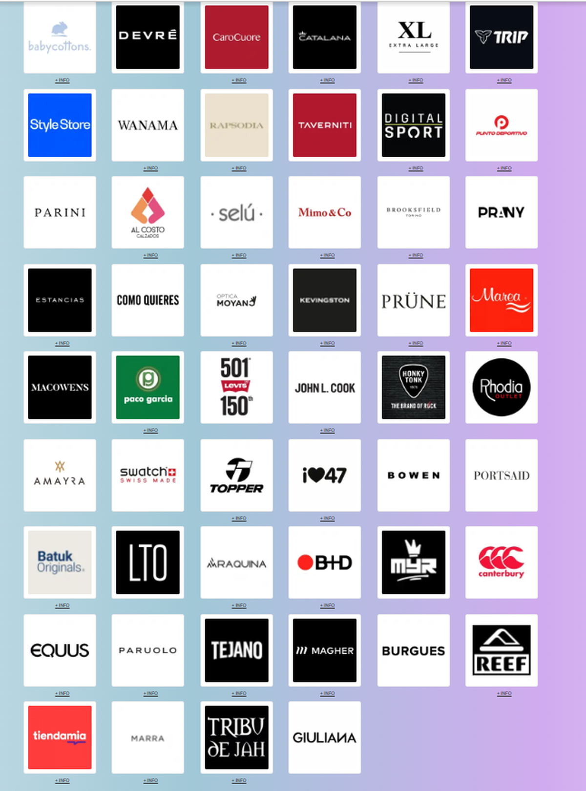 En la categoría Indumentaria y Calzado: Desde marcas como Lacoste, Rochas, Yagmour, Tucci, tiendas online de ropa para los más chicos como Jaguar, Grisino Cheeky, Babycottons, y hasta de carteras y bolsos como Amphora, XL, Prune, entre otras.