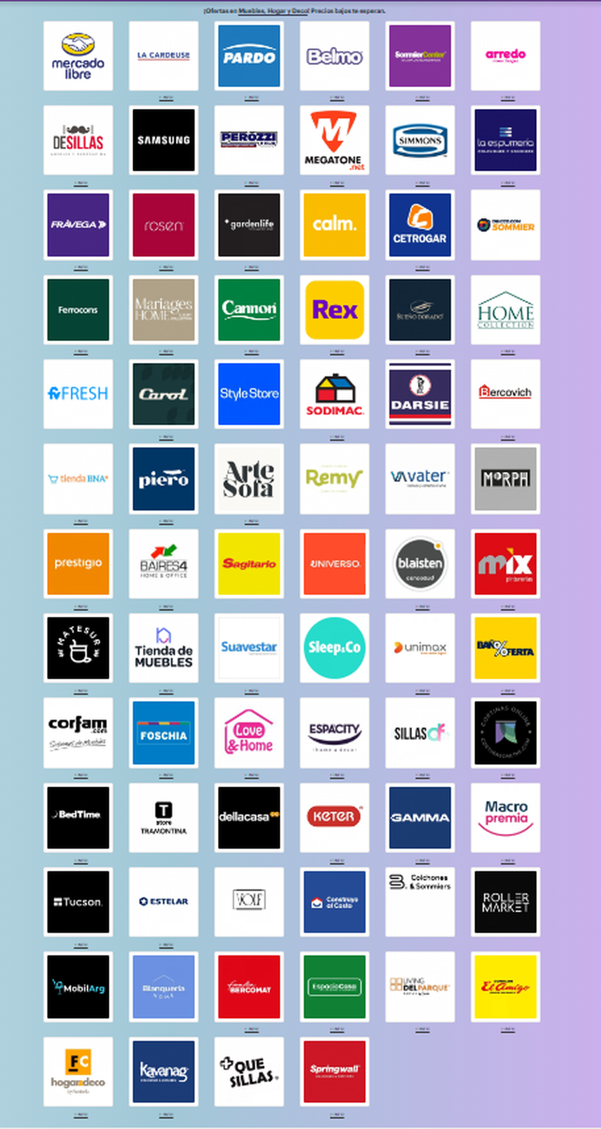 En la categoría Muebles y Hogar: Mercado Libre o bien La Cardeuse, Cannon, Piero, SommierCenter. También tiendas de decoración para el hogar como Arredo, Morph, casas de sillas y sillones como DeSillas, DellaCasa, o bien de artículos de cocina como Hudson-