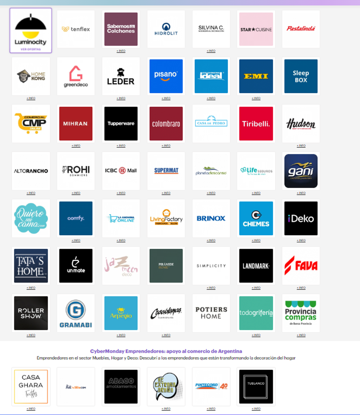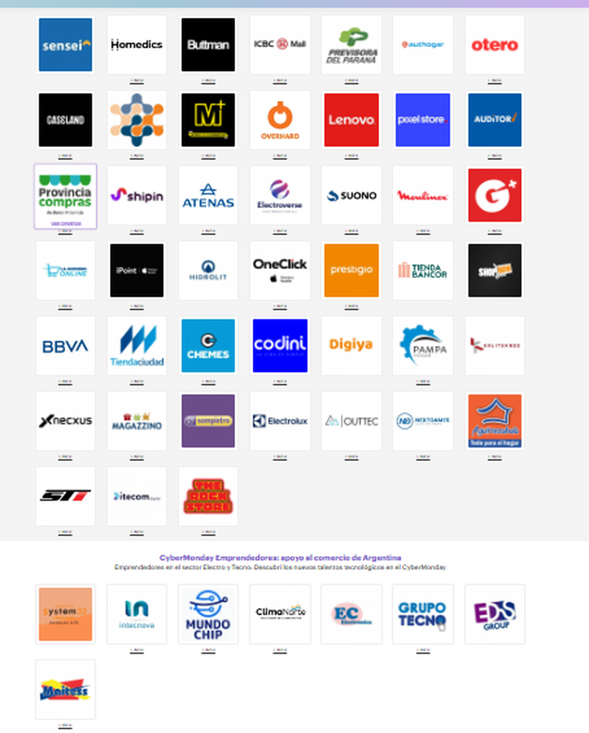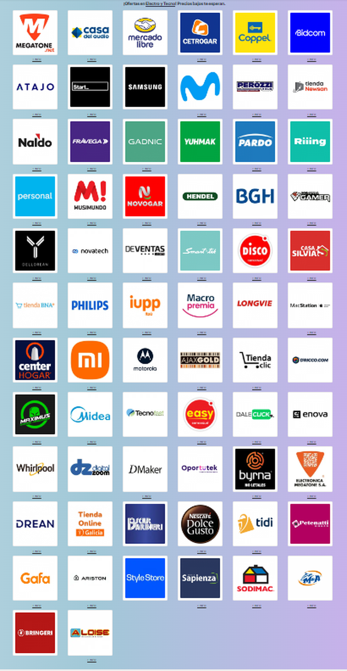 En la categoría Electro y Tecno: Mercado Libre, Frávega, Musimundo, BGH, Philips, Samsung, Lenovo, Easy, Disco, StyleStore, Megatone, Coppel, Naldo, entre otras.