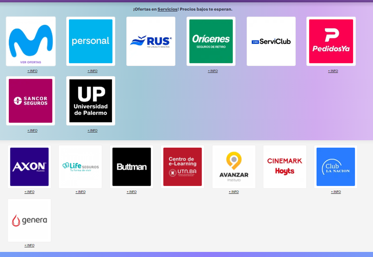 En la categoría Servicios: Empresas de telefonía como Movistar y Personal, empresas de seguros automotrices y habrán promos en Pedidos Ya o Cinemark Hoyts para aprovechar.
