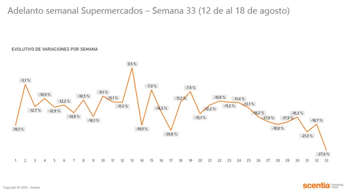 Pero los primeros días de agosto ya habían mostrado una profundización del deterioro de las ventas en supermercados: hasta el día 11, la merma había aumentado al 18,7%. Pero la situación directamente colapsó en la semana siguiente.