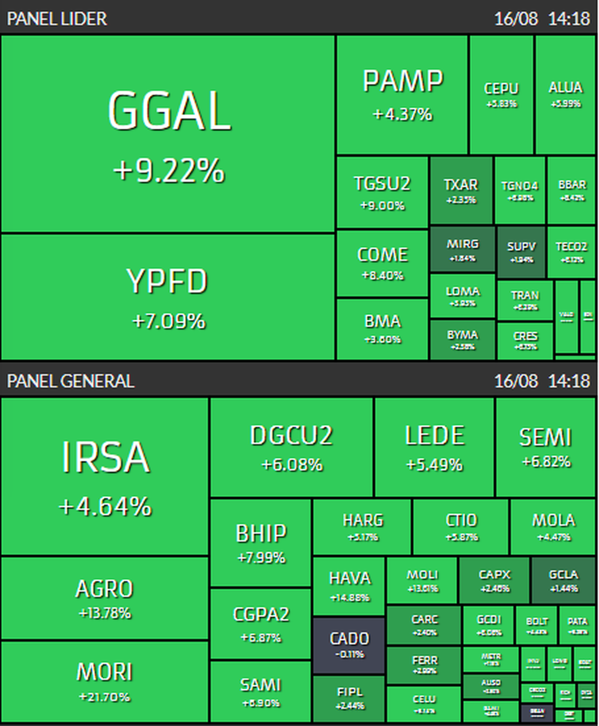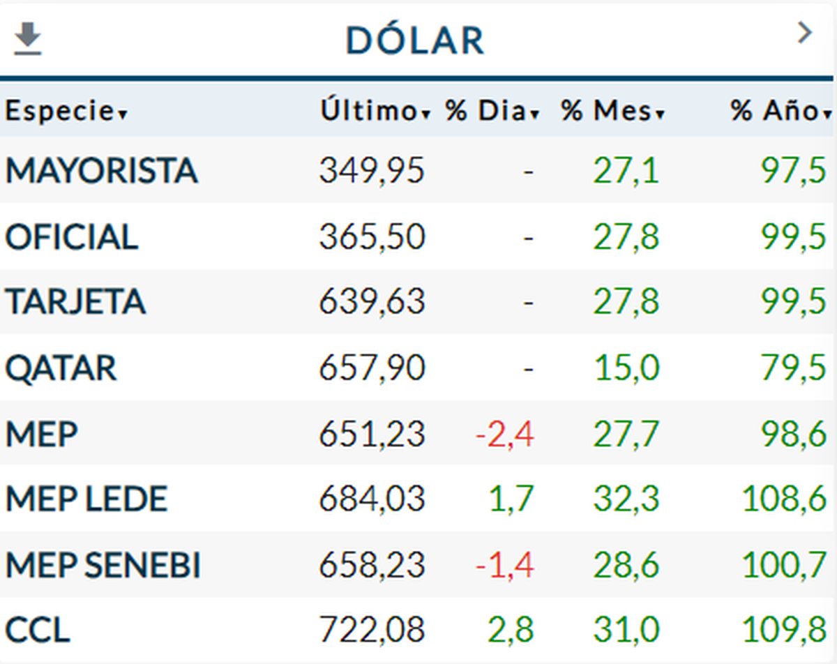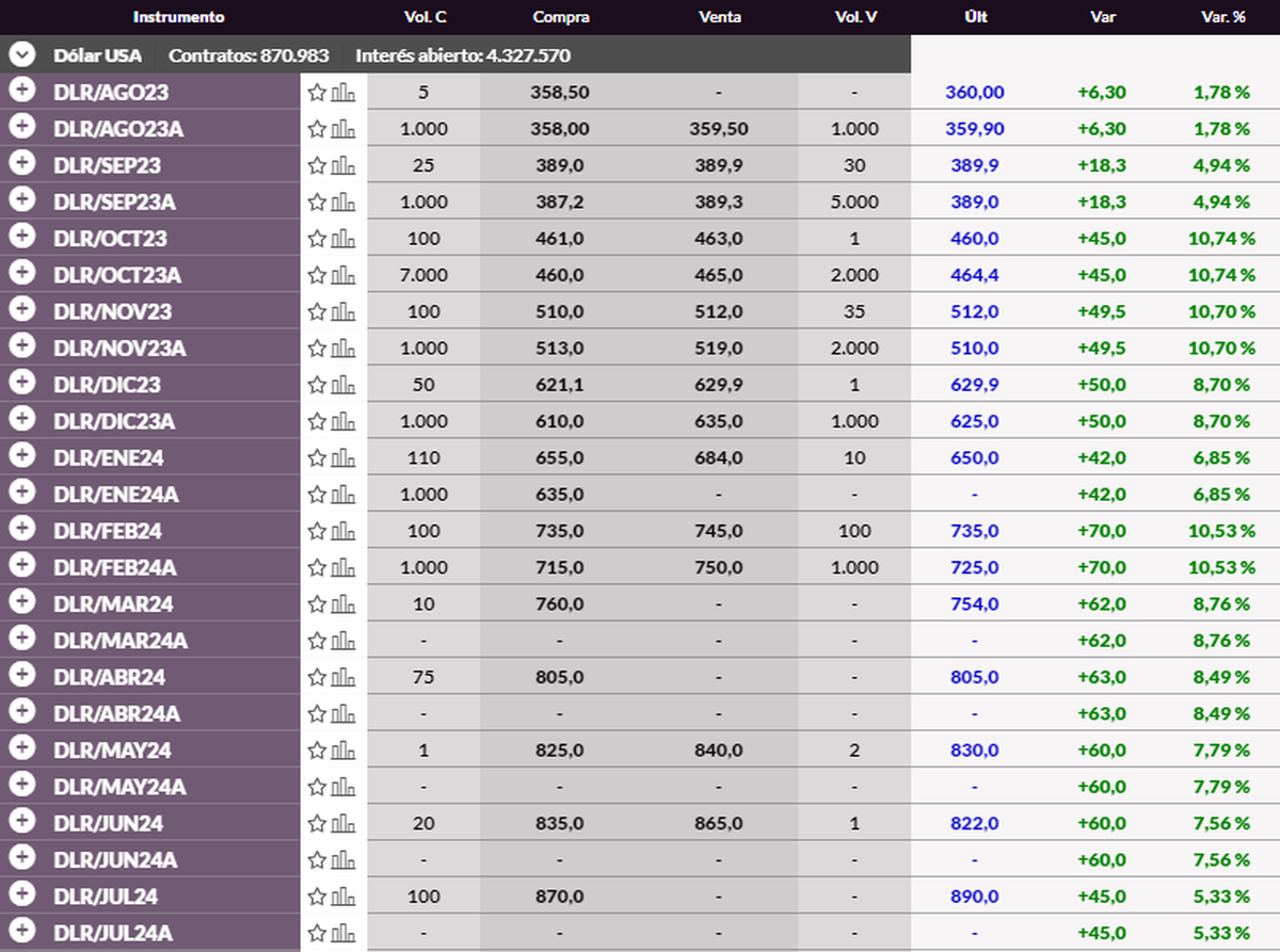 Por otro lado, los contratos del dólar futuro operan con fuertes alzas (de hasta el 10,7%) en todos los meses