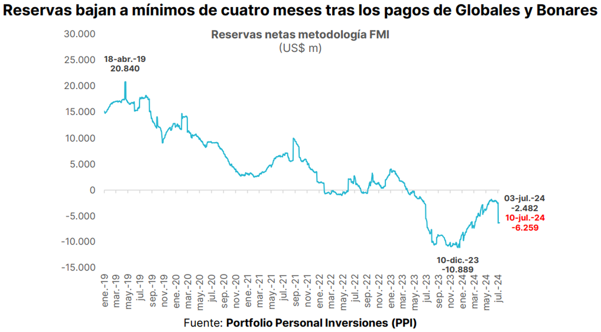 "A corto plazo, hay vencimientos con el FMI de capital por US$ 644 millones el 16 de julio y de intereses por US$ 838 millones a comienzos de agosto. Considerando que el FMI desembolsaría US$ 1.075 millones en septiembre (asumiendo que no habrá problemas en aprobar la próxima revisión), sigue habiendo un sobrante de dólares sin destino claro", indicaron.