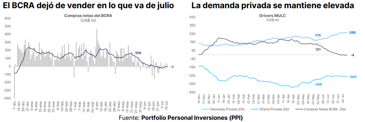 "El volumen operado en el MAE (indicador de la oferta privada) de US$ 268 millones, sumando todos los plazos y las bajas compras del BCRA, evidencian que la demanda privada sigue alta. En la media móvil de veinte ruedas, la demanda privada se sitúa en US$ 268 millones, aumentando un 53% desde los US$ 175 millones a finales de mayo", detallaron.