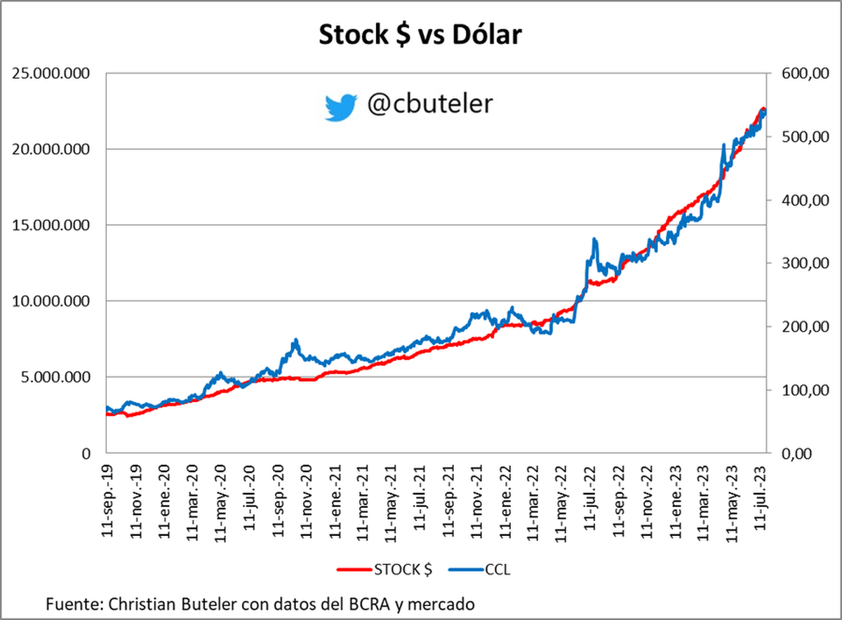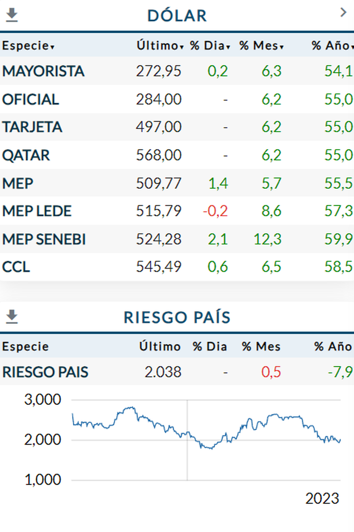 En tanto, el riesgo país se encontraba por arriba de los 2.000 puntos básicos y los tipos de cambio financiero cotizaban relativamente estables, demostrando que el dólar blue se vende caro: