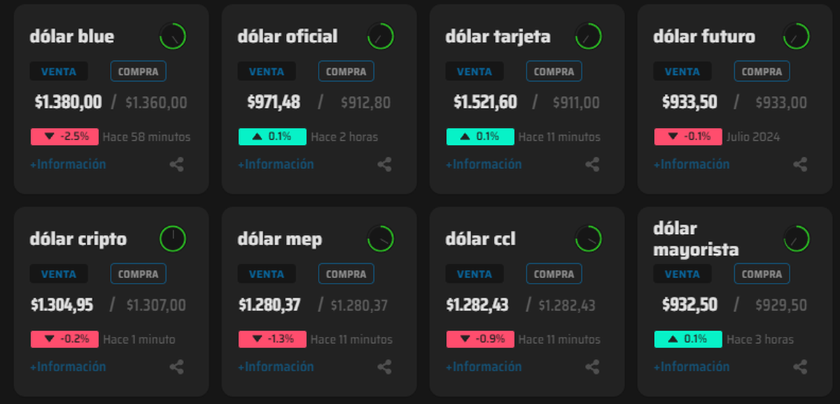 Más allá de los dólares financieros, si nos vamos al dólar blue a nivel nacional, según lo relevado por InfoDólar, nos encontramos con que el precio del billete se ubica en: