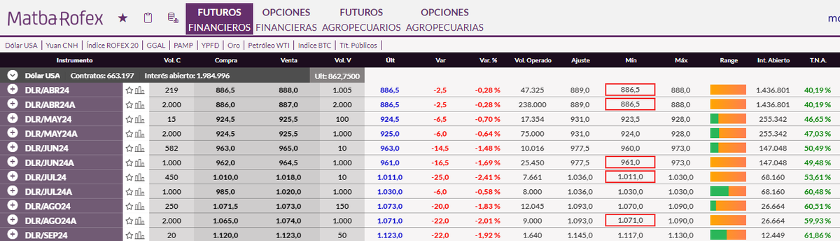 Por el lado del dólar futuro, todos los contratos presentan bajas, que se incrementan a medida que se alarga el plazo.