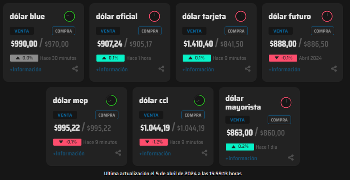 Este viernes 5 de abril, todos los tipos de cambio libres presentan nuevas caídas. El dólar blue, MEP, CCL y futuro se llevaron el protagonismo de la rueda. A las 16 hs, el billete se negocia a $990, el MEP (o bolsa) a $995,22 y el Contado Con Liquidación (CCL) a $1.044,19.
