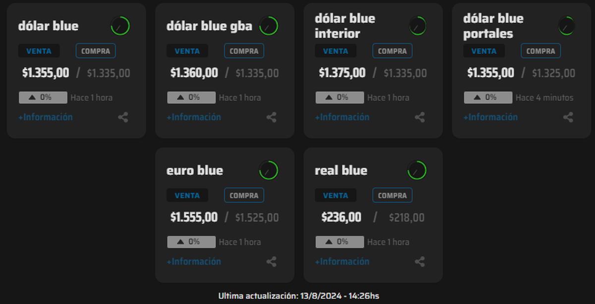 El dólar blue se mantiene hoy (13/8) a $1.355, mientras que las divisas financieras como el Contado con Liquidación (CCL) y el MEP continuaron con la tendencia bajista. Los analistas sugieren que es probable que los dólares paralelos sigan cediendo un poco más en el corto plazo debido a la estrategia de intervención oficial.