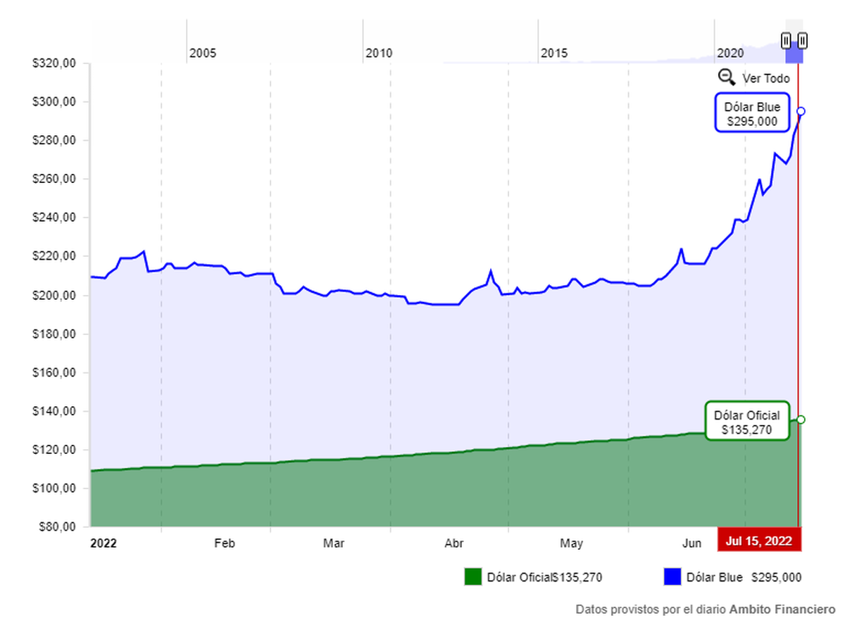 Dada la tensión e incertidumbre que hay en el mercado, más aún en el del dólar blue, donde el volumen de transacciones es bajo y poco transparente, comienzan a haber varias disparidades en cuanto al precio de la divisa. Tal es así que, desde el relevamiento del mercado negro de divisas de Ámbito financiero, el dólar blue tiene un precio de compra de $285,00 y $295,00 de venta.