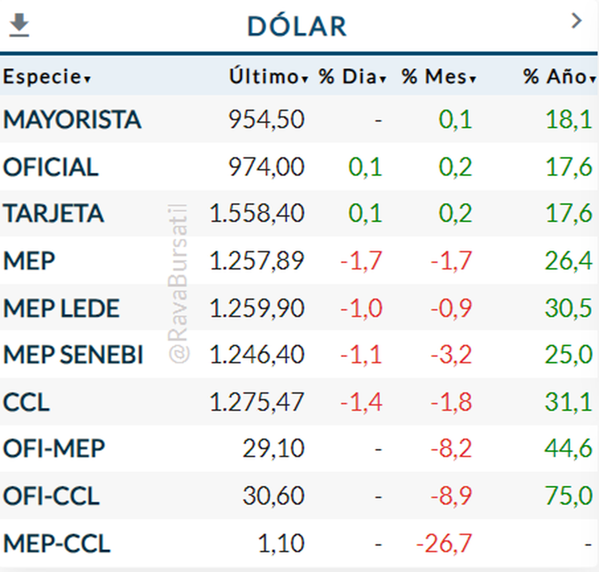 La tendencia bajista también se observa en los dólares financieros. El contado con liquidación (CCL), uno de los tipos de cambio más relevantes para operaciones financieras (que permite el giro de divisas al exterior), se ubica a $1.275,5.