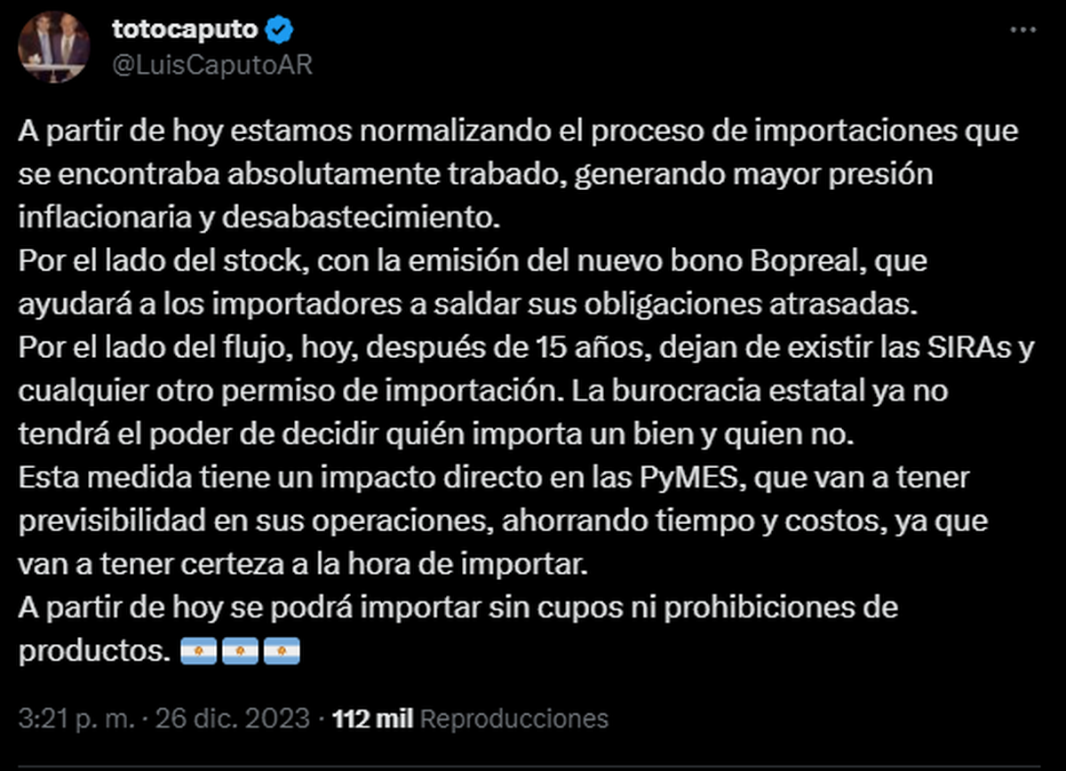 Tal como informó Urgente24 en: Adiós al SIRA: SEDI para importaciones, a partir de este 27/12, "Quien decida importar, va a poder hacerlo, no hay más vueltas". Con esas palabras el vocero presidencial, Manuel Adorni, confirmó la eliminación del sistema de autorizaciones para importaciones implementado por Sergio Massa, las denominadas SIRAS, que serán reemplazadas de ahora en más por Sistema Estadístico de Importaciones (SEDI), el cual no requerirá tramitar una licencia para los envíos destinados a consumo, según se informó. En definitiva, no se requerirá la aprobación por parte de la Secretaría de Comercio para realizar las operaciones, sino de la Ventanilla Única del Comercio Exterior Argentino (Vucea).