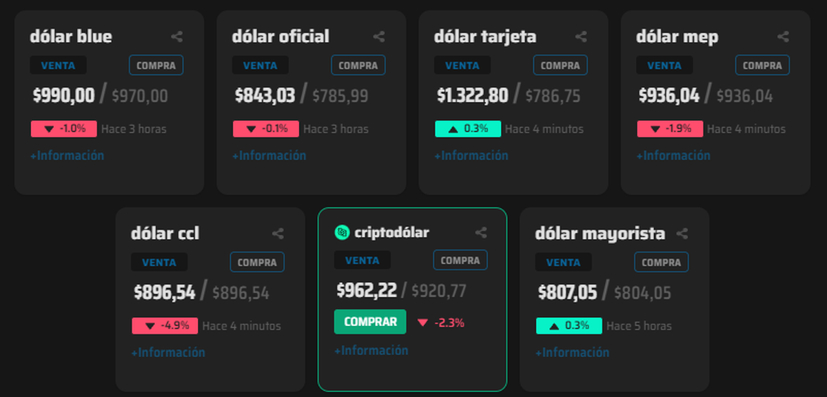 Asimismo, el dólar MEP presenta una caída de $23,34 (-1,9%), llegando a los $936,04. De esta manera, la brecha con el tipo de cambio oficial se amplía al 16%.