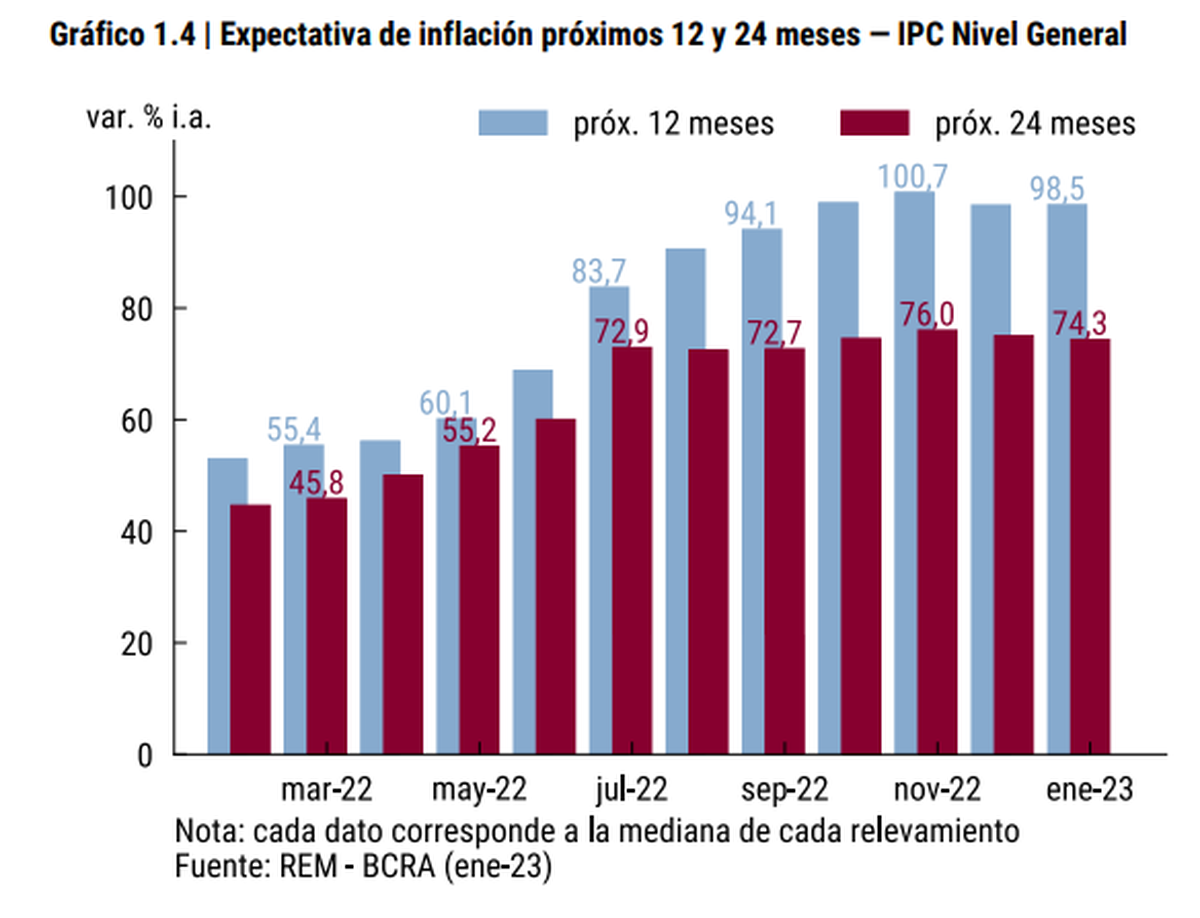 Respecto de la encuesta anterior, la previsión de inflación para los próximos 12 meses se elevó hasta 98,5% interanual. En tanto, la inflación proyectada para los próximos 24 meses (entre ene-24 y ene-25) se redujo hasta 74,3% interanual.