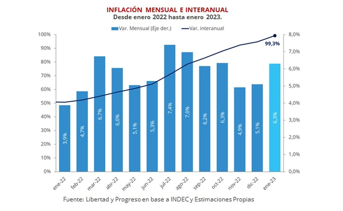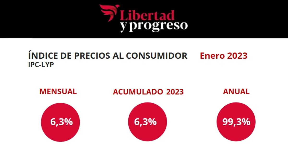 Por otro lado, La Fundación Libertad y Progreso (LyP) arrojó que enero viene con un avance del 6,3% mensual. Como resultado, la variación interanual trepó a 99,3%, quedando solamente a 0,7 puntos porcentuales de los tres dígitos. Las variaciones de este mes estuvieron condicionadas en gran medida por los ajustes de precios regulados, tales como electricidad, gas, combustibles y medicina privada.