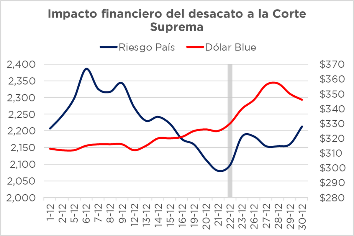 Luego de esto, la consultora Iván Carrino y Asociados, destacó que: el dólar llegó a subir $32 en 5 días. El Riesgo País avanzó 133 puntos desde entonces. Luego, el 26 de diciembre, Fernández rectificó su posición y el escenario se calmó