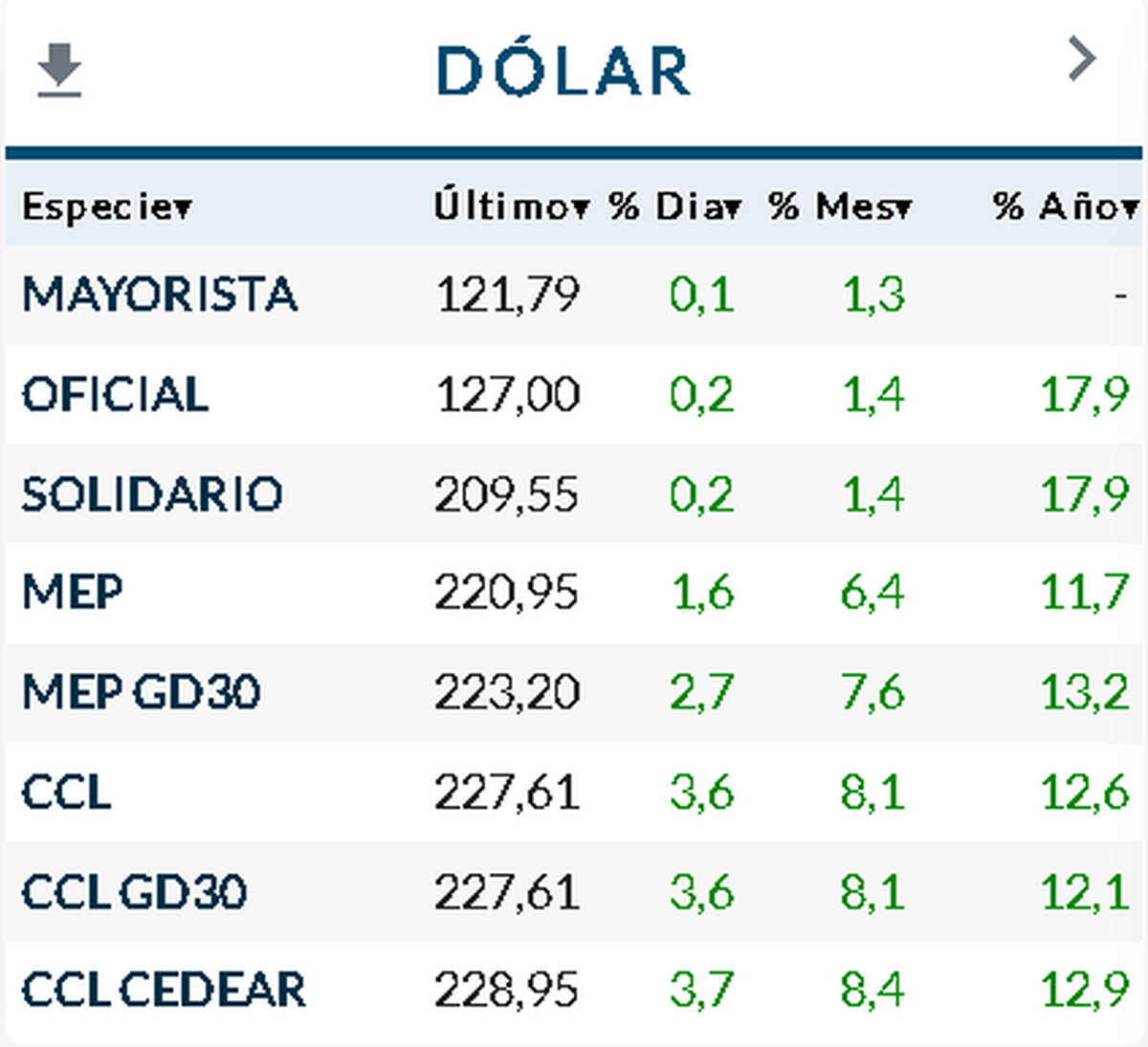 Por otra lado, las cotizaciones financieras siguieron al alza luego de la caída de los bonos CER -ajustan por inflación-. El MEP a través del AL30 y el contado con liquidación (CCL) con el GD30 avanzan 1,1% y 2,6% para acercarse a los $ 220 y $ 225, respectivamente. Así, alcanzan sus niveles más altos de los últimos cuatro meses. De acuerdo con Rava Bursátil, así cotizaban los distintos dólares del mercado: