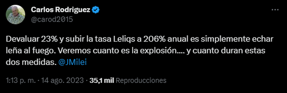Precisamente Rodríguez -fundador de la Universidad del CEMA, ex asesor del BCRA y del Palacio de Hacienda, cercano colaborador de Milei- acaba de advertir que las medidas dispuestas por Massa sólo anticipan la citada "explosión". En la red social X o Twitter (?), él advirtió con posteo a Milei: