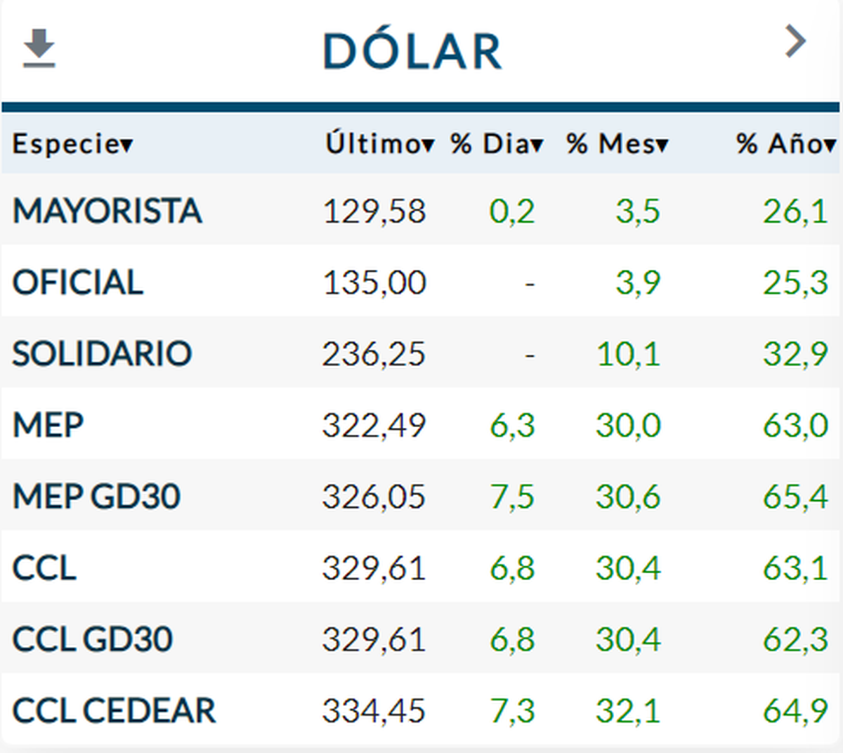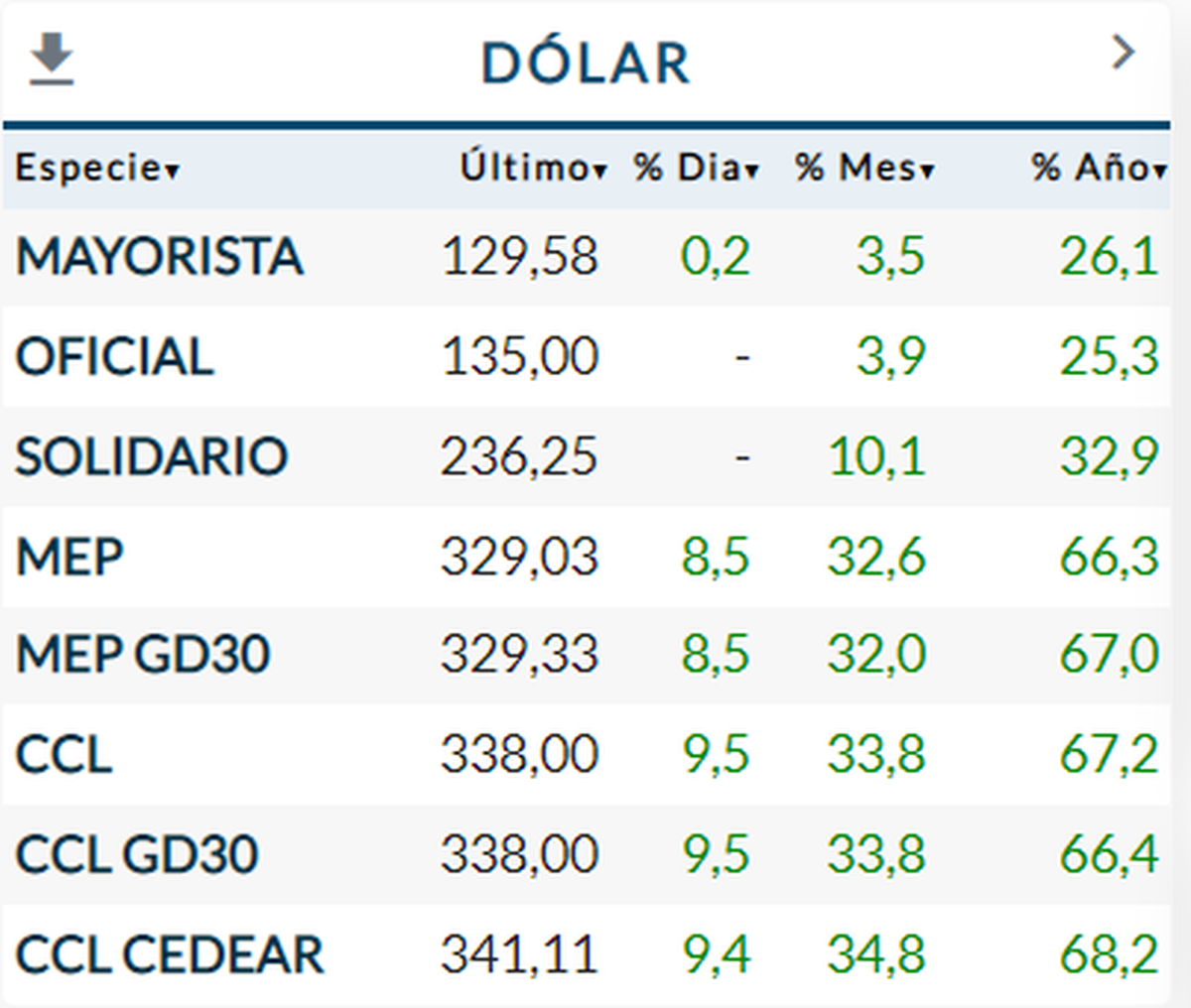 Por el lado de los dólares financieros, MEP -o bolsa-, Contado Con Liquidación -CCL-, se calmaron del fuerte aumento evidenciado al principio de la jornada, de acuerdo con Rava Bursátil estos dólares cerraban: