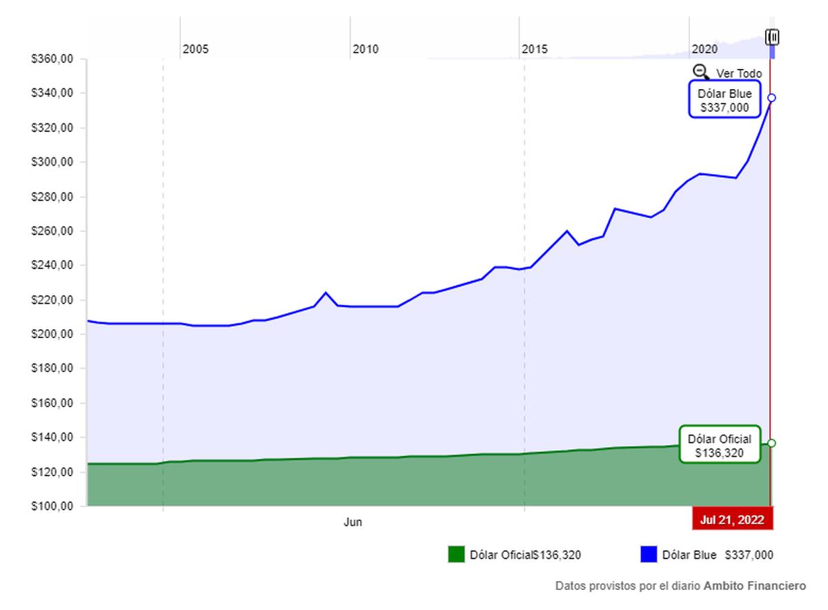 Este jueves 21 de julio estuvo marcado de fuertes corridas por parte de la población argentina y esto se vio fuertemente reflejado en los aumentos en los distintos dólares presentes en el mercado. De acuerdo con Ámbito Financiero, el dólar blue cerró a $337 que, con un dólar oficial a $136,32 provocó que la brecha se expanda todavía más y alcance la cifra del 147,2%.