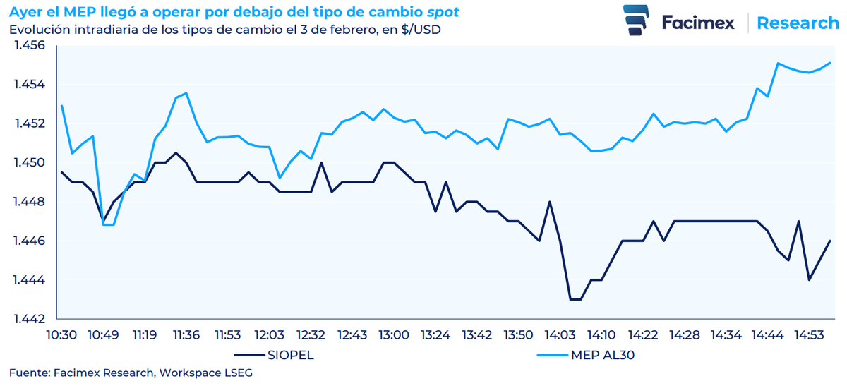 Tras la fuerte corrección del CCL en las últimas ruedas, el canje entre MEP y CCL terminó la jornada en 0,7%, también en mínimos desde fines de octubre. Para dimensionar el cambio, en diciembre y enero ese spread promedió el 3,0%, impulsado por las colocaciones de deuda corporativa en el exterior que solían presionar al contado con liquidación.