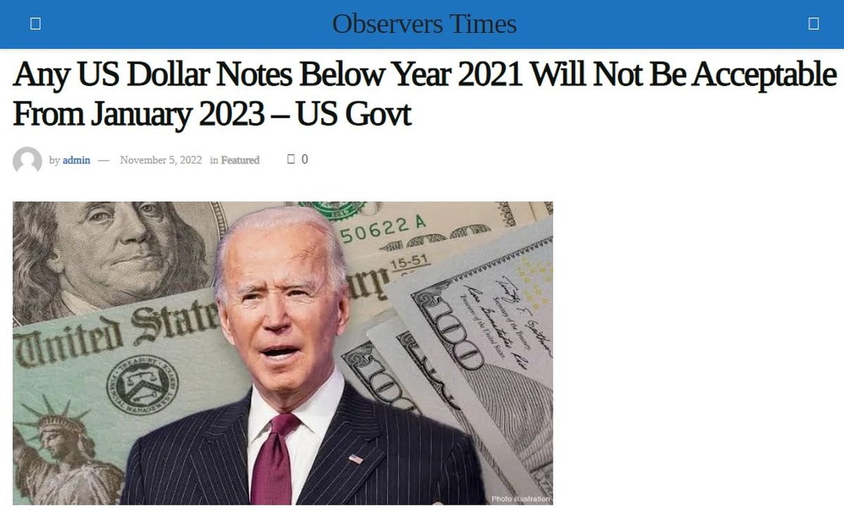 Todo comenzó el 5 de noviembre de este año en curso, cuando un portal estadounidense llamado Observers Times, publicó un artículo que dice lo siguiente: Los billetes en dólares estadounidenses inferiores al año 2021 no serán aceptables a partir de enero de 2023: Gobierno de EE. UU.”