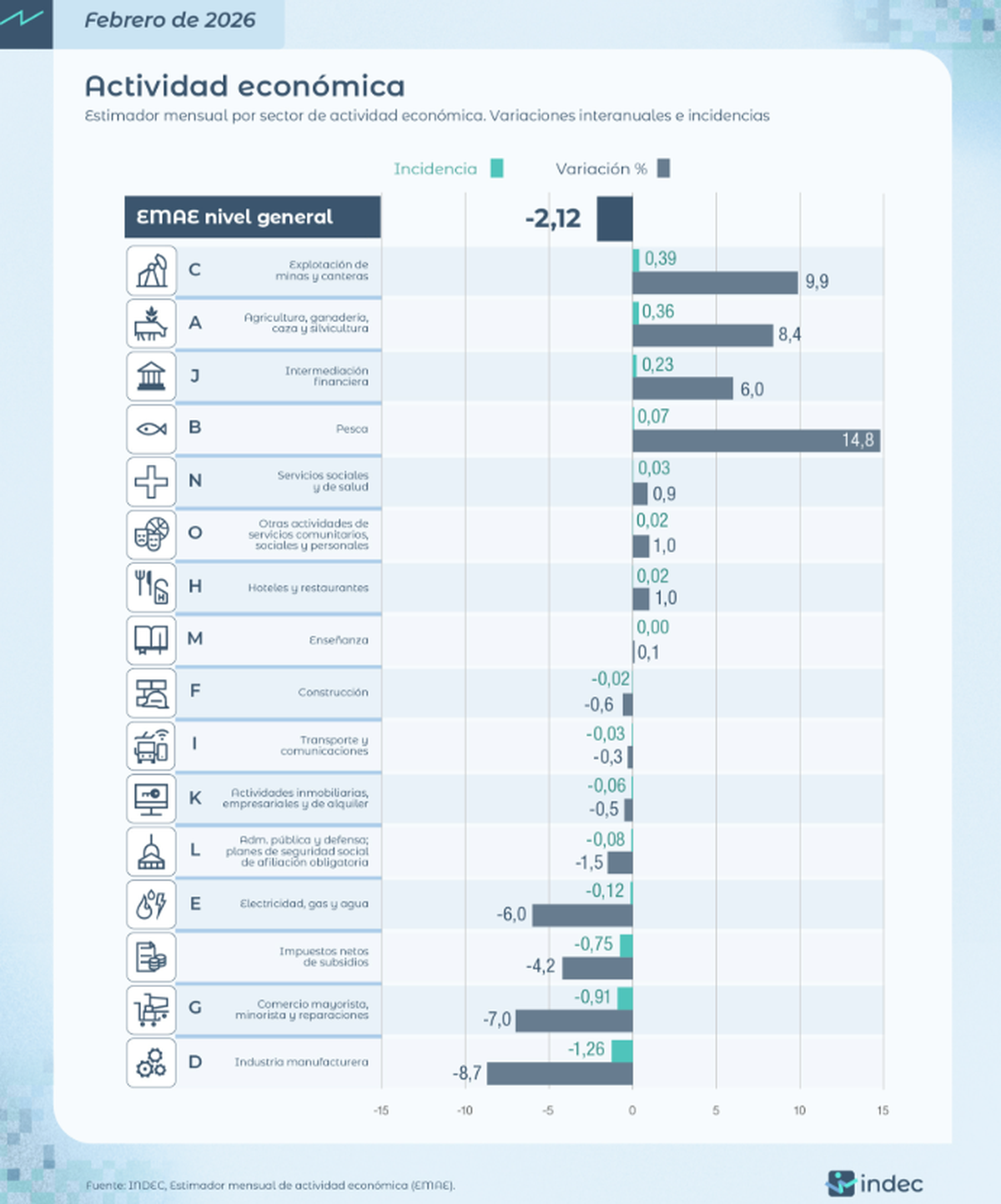 La actividad económica cayó 2,1% interanual en febrero de 2026 y 2,6% con respecto a enero, según los datos del Estimador Mensual de Actividad Económica (EMAE), del INdEC. Se trata de un dato muy negativo: es el peor retroceso mensual desde diciembre de 2023.