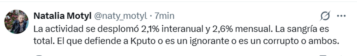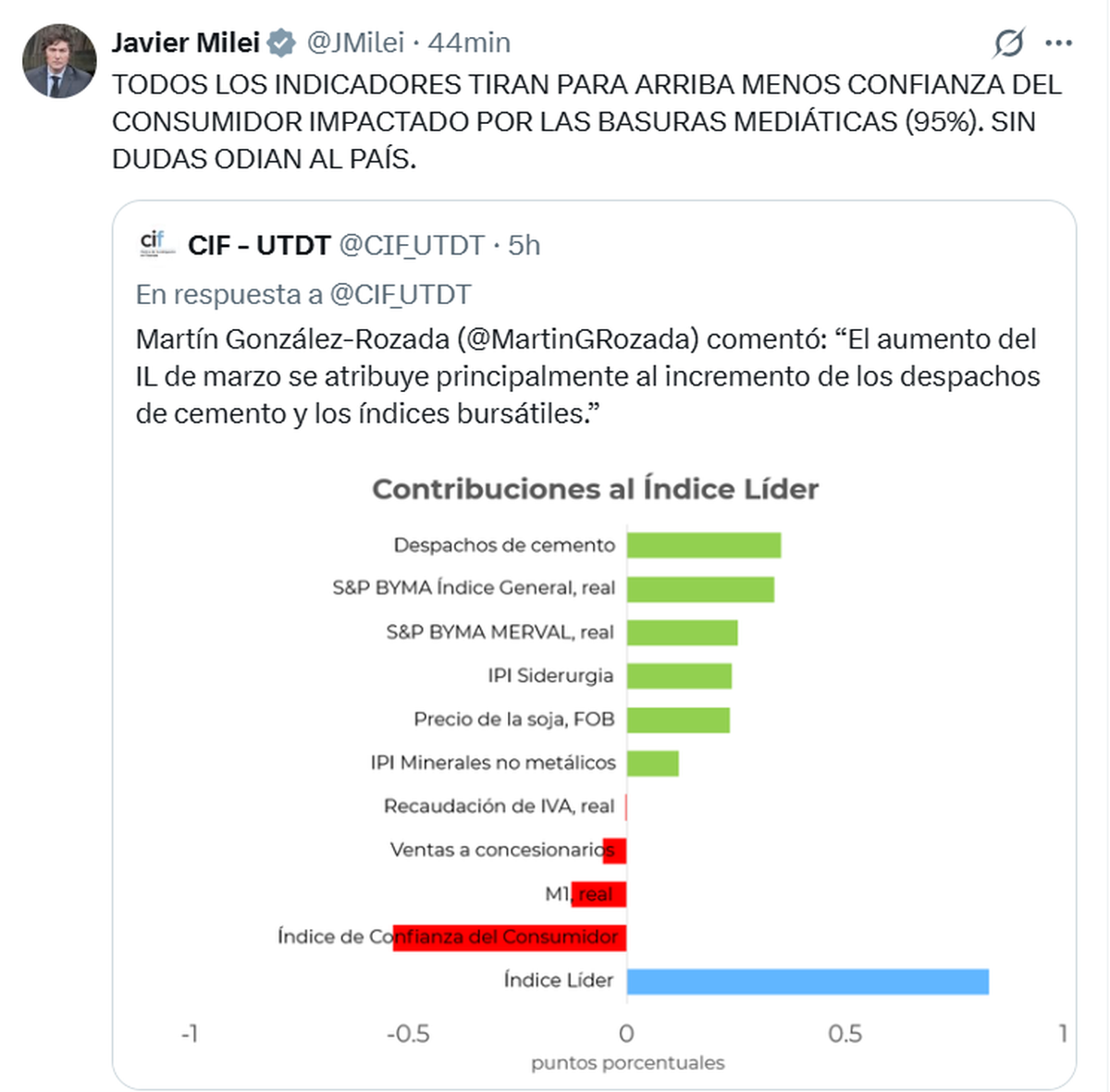 Apenas 15 minutos antes de que el INdEC informe el EMAE de febrero, un dato muy negativo, Javier Milei había realizado un posteo en X asegurando que "todos los indicadores tiran para arriba, menos confianza del consumidor impactado por las basuras mediáticas".