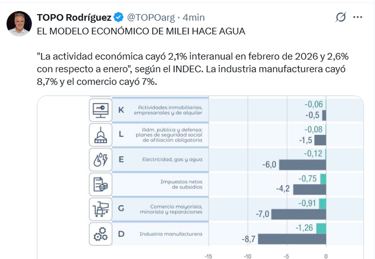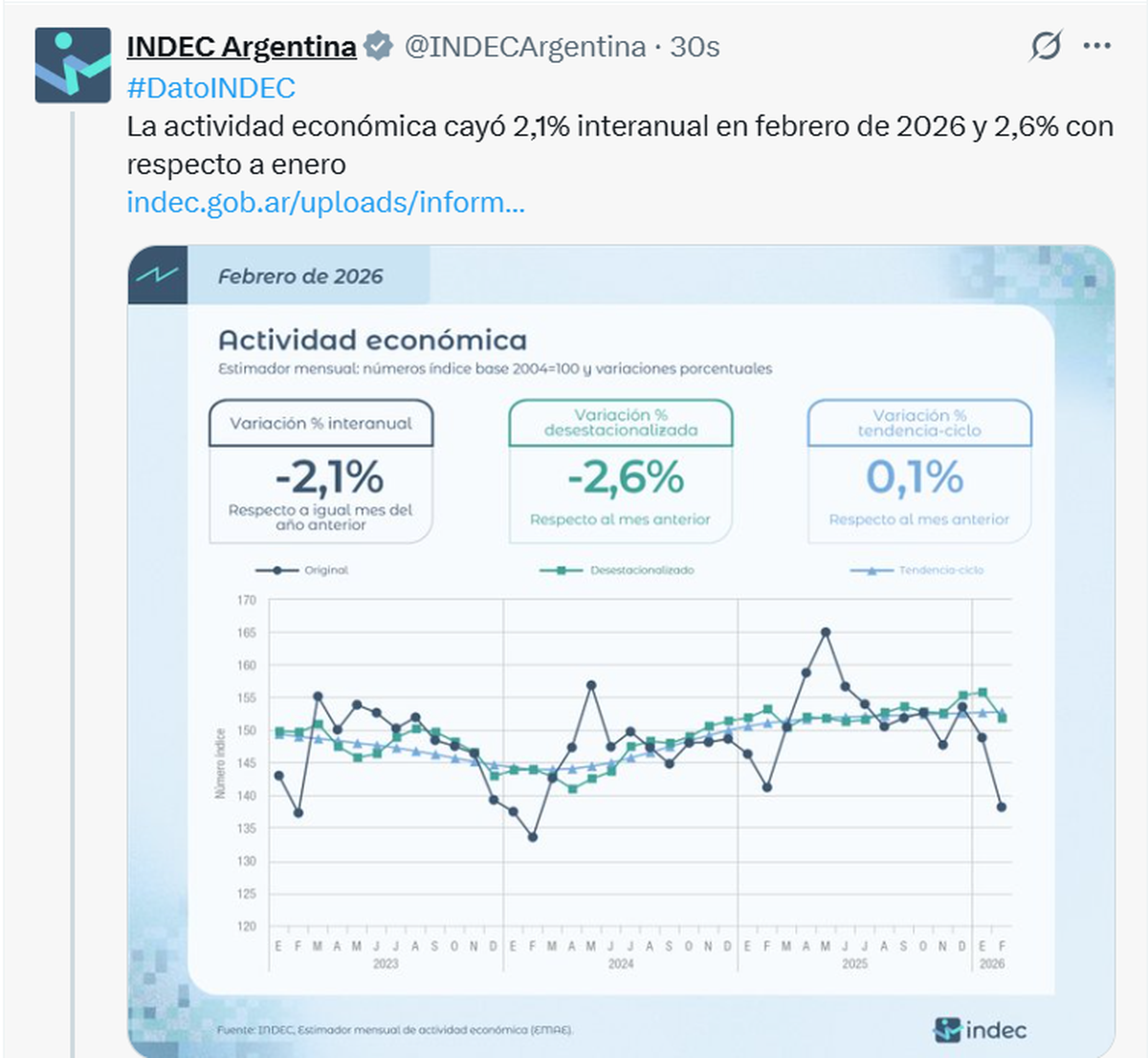 Según el INdEC, la actividad económica cayó 2,6% en febrero, y 2,1% interanual. Es el peor retroceso desde diciembre 2023. ¿Qué dirá Milei ahora?