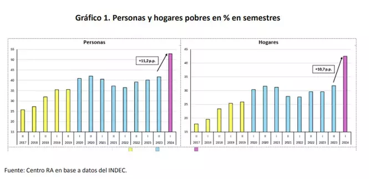 El informe también agrega que la pobreza y la indigencia son los indicadores más preocupantes de la gestión del gobierno hasta el momento. Aunque los niveles heredados del gobierno anterior ya eran elevados (41,7% de las personas y 31,8% de los hogares se encontraban en situación de pobreza), las políticas de ajuste implementadas por el gobierno de Javier Milei han provocado un aumento significativo en este sentido.