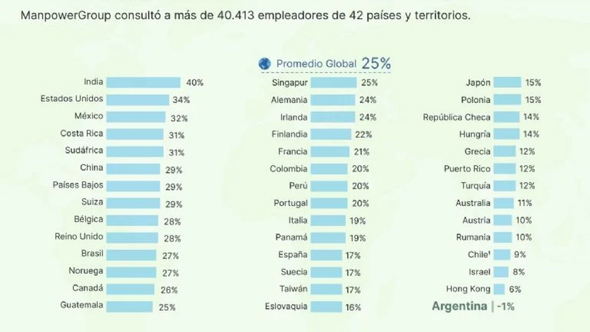 Además, obtuvo que, entre los 42 países y territorios relevados, la Argentina es el único con un resultado negativo (-1%) de expectativa neta de empleo para los próximos tres meses, esto es, el arranque del año que viene.