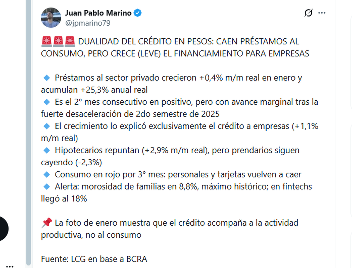 Esto se suma a los datos de la economía real y del consumo conocidos en los últimos días: una situación actual de ventas en supermercados que sigue mostrando mayor peso de evaluaciones negativas y un optimismo de cara al futuro que se retrajo tras fin de año, ampliaron desde el mismo informe.