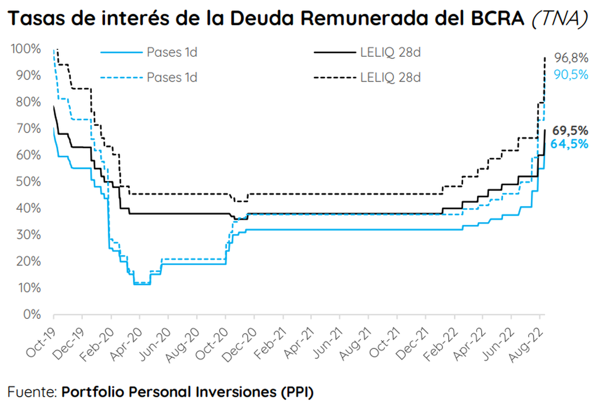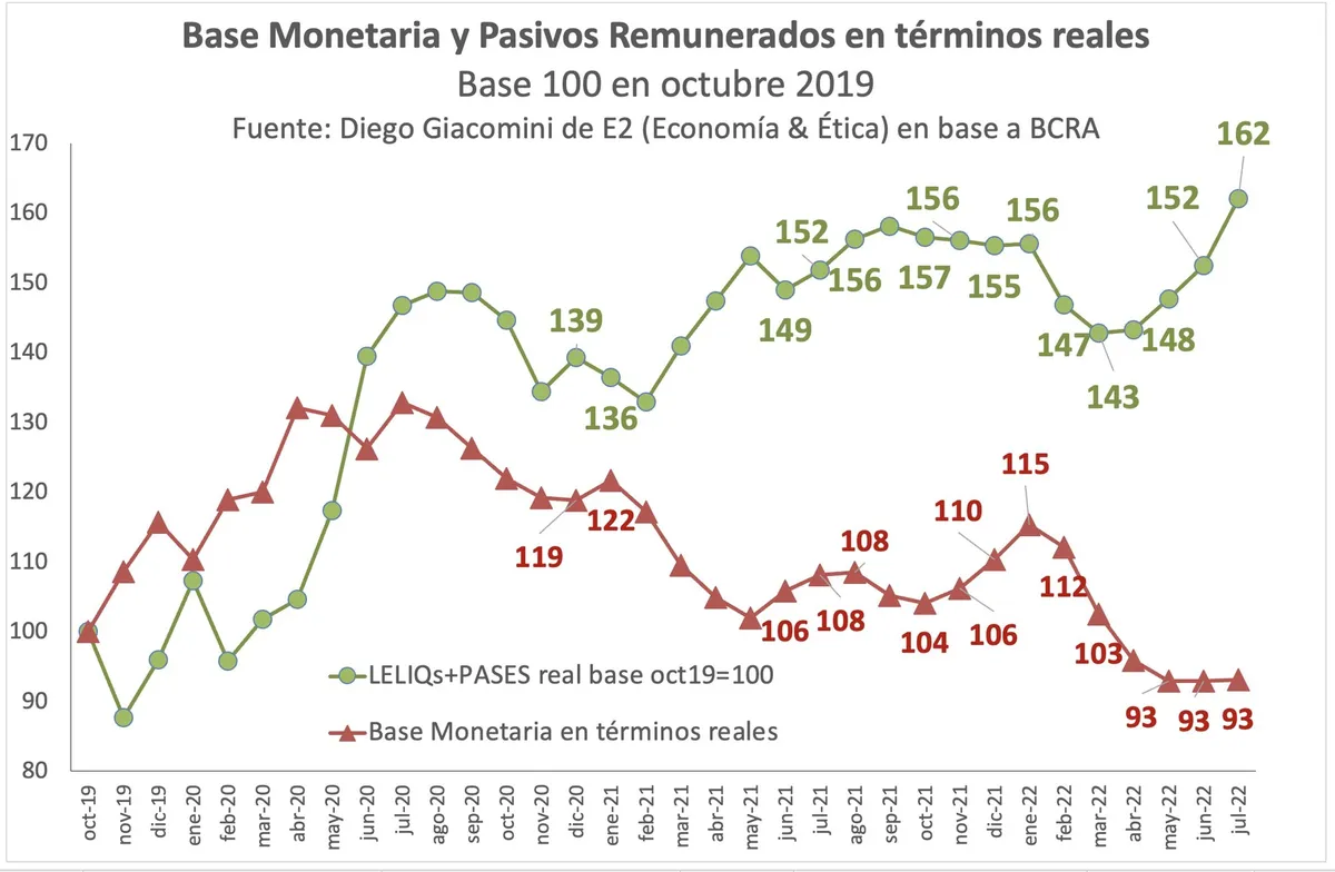 Esta nueva suba de tasas provocará que los pasivos remunerados del BCRA -LELIQ + pases- devenguen cerca de 6,7 billones de pesos por año. Esto quiere decir que, la autoridad monetaria va a estar "obligada" a emitir alrededor de 1,56 bases monetarias por año para poder contener esa masa de pesos.