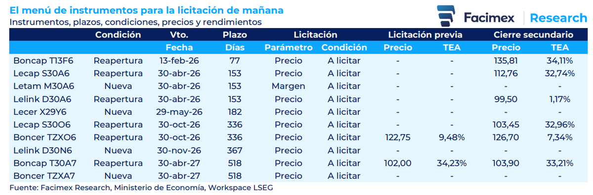 También se suma la nueva Letam M30A6, los Lelink con vencimientos en abril y noviembre, además de la Lecer X29Y6 y los Boncer de octubre y abril de 2027. Una batería amplia que, otra vez, deja afuera cualquier alternativa menor a los dos meses. La prioridad es clara: empujar el perfil de vencimientos hacia adelante.