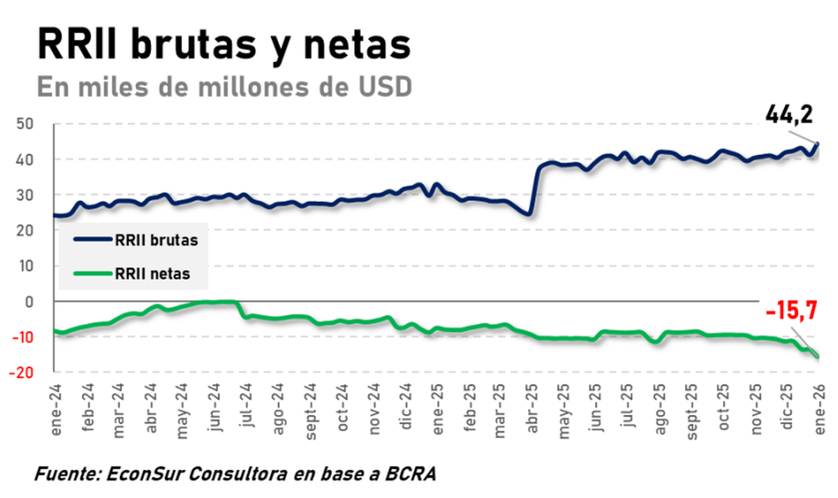 Al viernes 16 de enero, las reservas brutas alcanzaron los US$44.607 millones, mientras que la compra diaria de divisas fue de US$125 millones, una señal clara de continuidad en la política de acumulación. En paralelo, el tipo de cambio minorista promedio vendedor se ubicó en $1.453,44, confirmando que el dólar se mantiene contenido dentro del esquema de bandas y lejos del techo operativo.