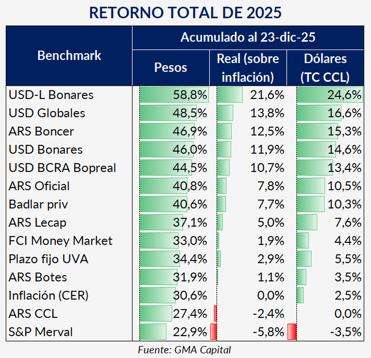 En el ranking anual tal como señalan desde GMA Capital, los bonos Dollar Linked lideraron con un retorno del 24,6% medido al CCL, seguidos por los Globales (16,6%) y los bonos CER (15,3%), favorecidos por la compresión del riesgo país. En el extremo opuesto, el S&P Merval cerró con una caída del 3,5% en dólares, ubicándose en el último lugar.