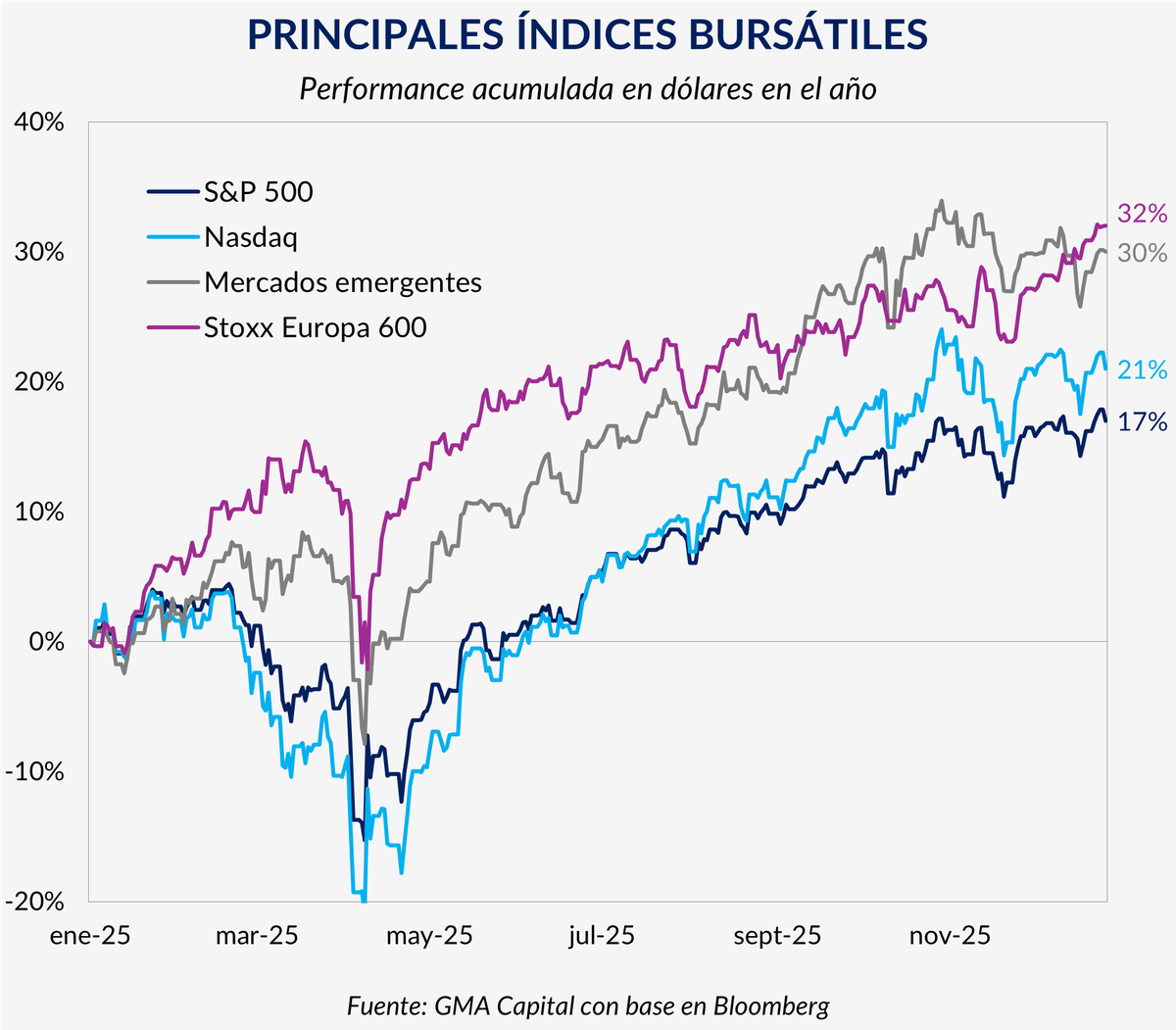 A nivel internacional, el telón de fondo estuvo marcado por la ofensiva comercial de Estados Unidos, impulsada por Donald Trump durante el denominado Liberation Day, y por la creciente competencia tecnológica con China. El clima de incertidumbre fue persistente, aunque insuficiente para frenar la suba de los principales mercados accionarios. El S&P 500 avanzó 17,3% en dólares, con el sector tecnológico como principal motor y la Inteligencia Artificial concentrando flujos, inversión y utilidades.